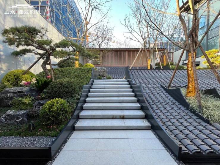 如果你去项目实地看下,一定会被入口界面攥住眼球。迎面而来的就是一大块的琉璃景墙,档次拉满,拾级而上,到处是屋瓦铺陈的漂亮景观,绿植穿插其间,主打一个“归家即度假”的松弛氛围感。