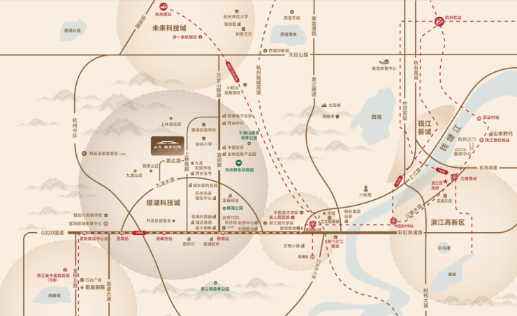 项目位于富阳区连接主城的桥头堡——银湖,可能很多人还没注意到,在杭州现有的城市格局下, 银湖已是杭州少数去往各个城市中心都方便的板块。