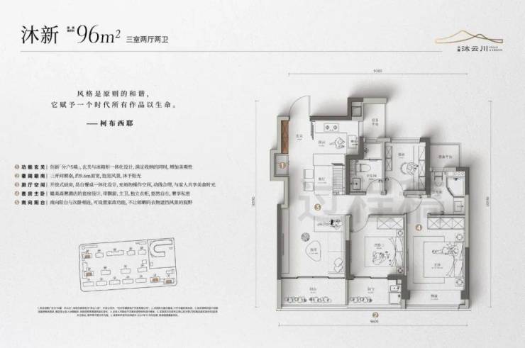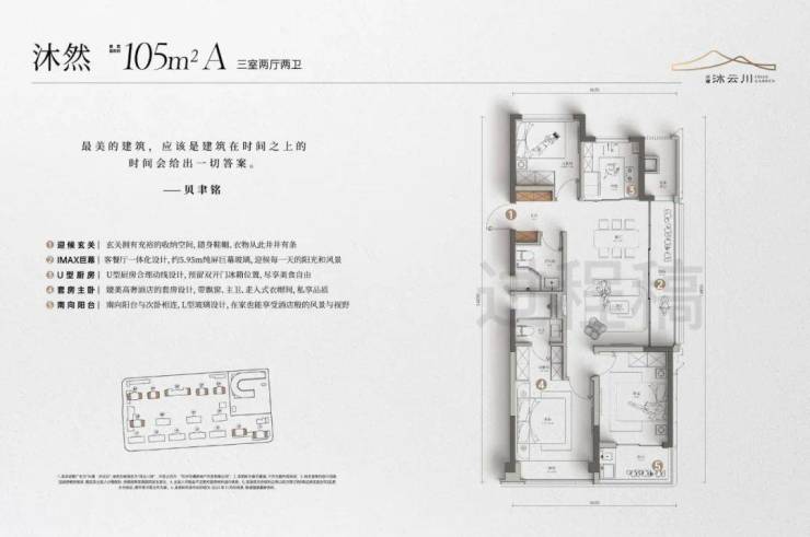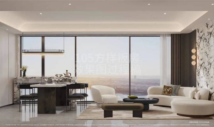 建面约105m²的户型有近6m的纯屏巨幅玻璃,大大提升了采光和观景的需求,“起床就能看到风景”。