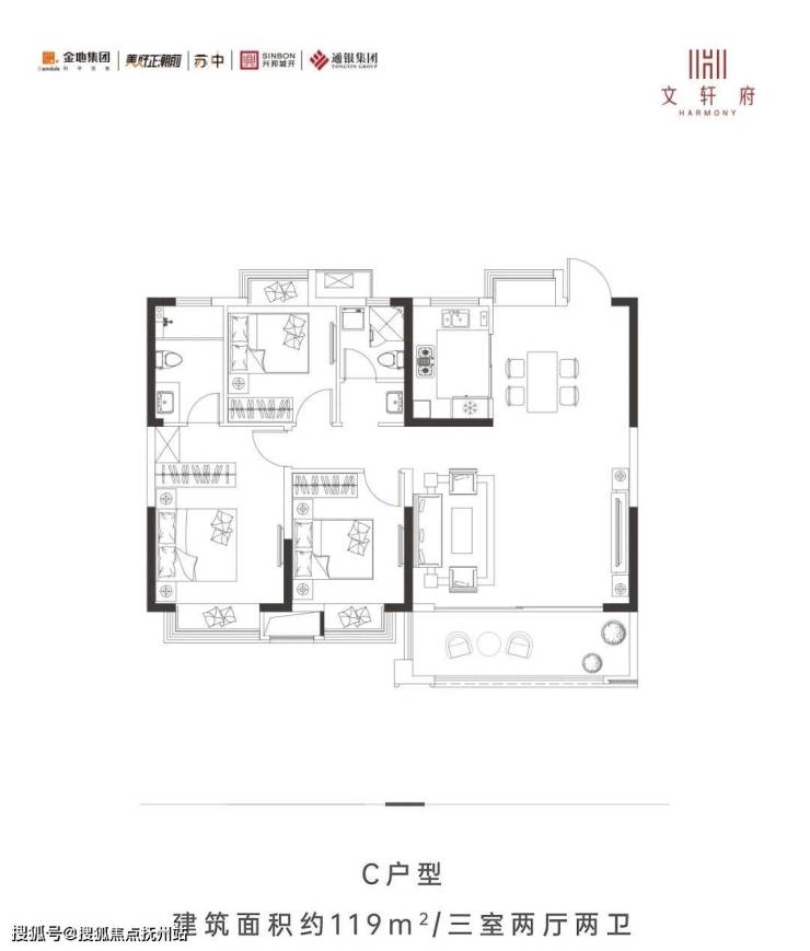 以118㎡三室两厅两卫为例,三开间朝南布局,客厅外连瞰景阳台,尺度宽达5.6m,家主居家待客,从容气派,亦能帮助子女从小培养社交礼仪及习惯。