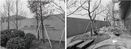 在有限的空间内,以与建筑同色的灰色围挡立面作为载体,任凭摇曳树影恣意投射之上,向阳乌桕,肆意怒放,光影静谧、庭院翠蔓,虚实互见,将空间清雅的气质进一步烘托。在看似冰冷、浮躁的都市里,树与场地,建筑,光影,相应成景,焕发出一沙一世界,一树一菩提的生命禅意。