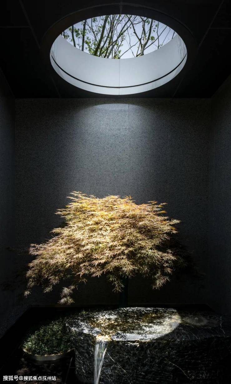 建筑灰空间的天窗小景,打造半室外的框景设计,灵感来源于路易斯·康光影运用的启发,在这一方天地中,自然光给予了空间特性,也给予了建筑与景观无穷的生命力,一幅《静谧于光明》的画卷伫立于眼前,青树翠蔓,蒙络摇缀,参差披拂,花叶扶疏,意渺然。