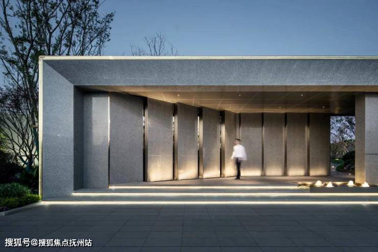 入口横向延展面设计从动态的夏溪河水纹中提炼意形与光影元素,融入到建筑的一体化设计中,大有“言入夏溪曲,光影转庭柯”的朗阔雅境,大气开阔又不失婉转潋滟。在地文化与现代审美相互渗透的秘境溪居跃然呈现于门庭,铺陈开崇高而永恒的流水情怀,隔绝喧嚣,启幕自然。