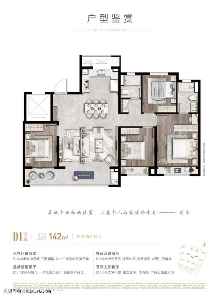 该户型约14.5米巨幕面宽+南向开间三卧朝南的布局符合当下改善所需。