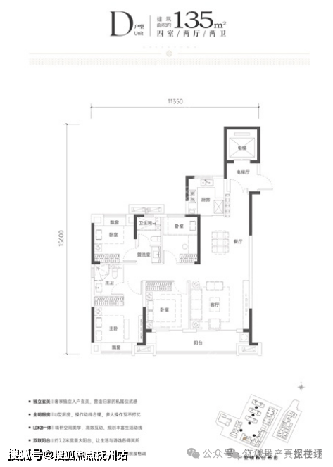 建面约135平的南北通透的四房是该项目相对不错的户型: