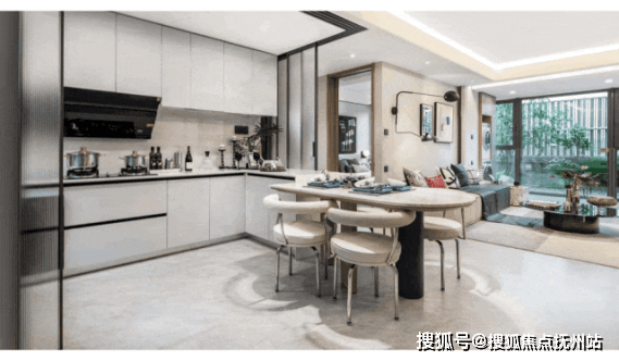 半开放式厨房通过金属移门做分割,烹饪时可拉上门隔绝油烟。并且保障了家庭成员的互动性,不让厨房成为“孤独的角落”。