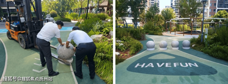 儿童玩乐区「森玩之丘」增设石球路障,杜绝电动车抄近道穿行,让小朋友可以放心奔跑玩耍;