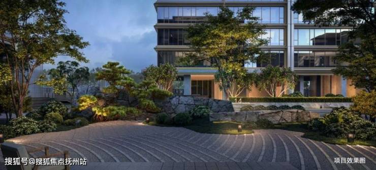 二境——揽潮映月:入口水景内庭院,塑造抽象的起伏浪潮与优雅的弦月形态,如同一幅雕塑作品,展现宛若美术馆的宁静而高雅格调。