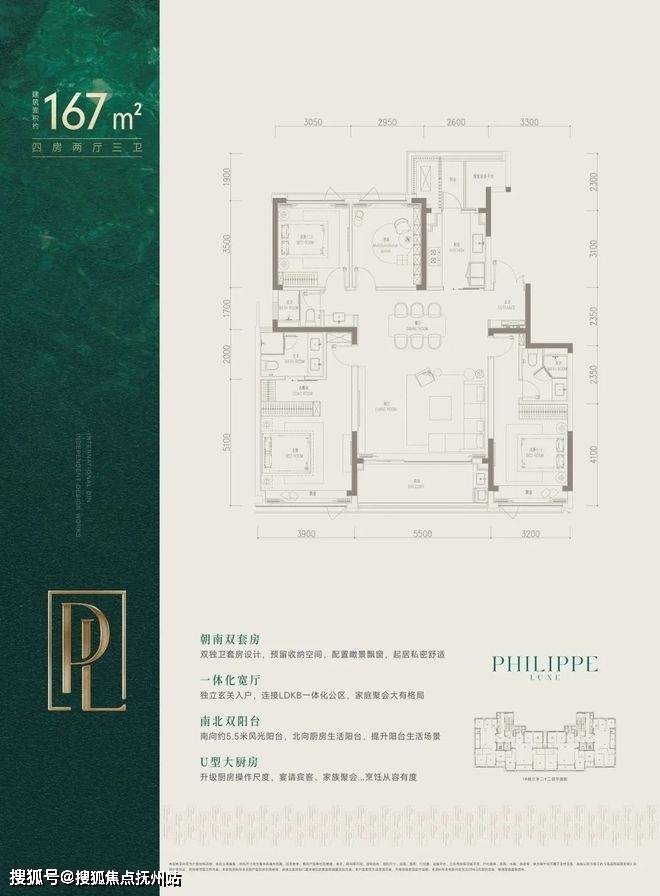 建面约167㎡南厅户型,四房两厅三卫,两梯两户,客厅南向开间5.5米,主卧开间3.9米,厨房北侧还配有小面积阳台。