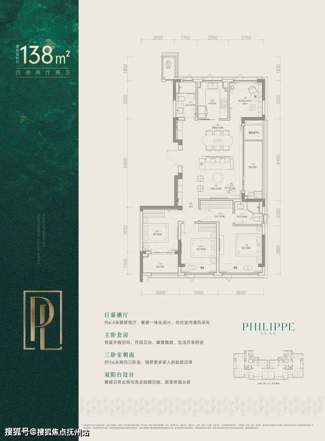 户型方面共有两款可选,起步户型为建面约138㎡边厅户型,四房两厅两卫,两梯两户,三房朝南,双阳台设置。