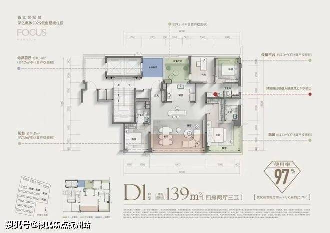 先看建面约139㎡四房三卫户型。LDKB的户型设计;封包阳台+主卧L型飘窗;双套卧、三卫;南向超大开间;专梯专户、尊享电梯前厅...