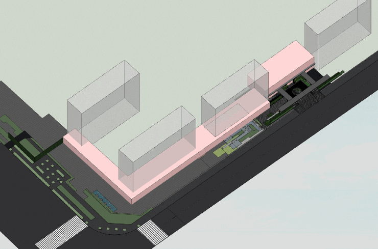 沿街界面结合不同功能分别置入不同个性的盒子模块,并将边缘空间景观化。我们希望以更柔软的表情,让社区和城市的边界是可停留的、丰富性的、自然感的。市民可在此休憩,让建筑成为公园的一部分,也代替了围墙的功能,模糊了社区的边界。