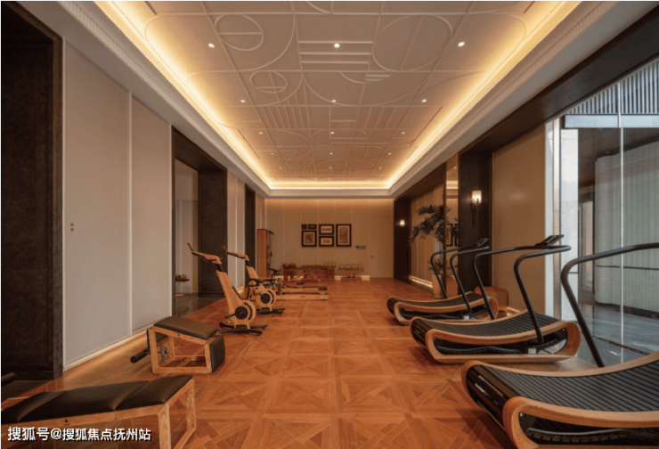 传承百年工艺手工打造拼花地板,隐匿式氛围光模拟塞纳河畔落日,器材选择上,为业主定制的沃特罗伦(WaterRower)品牌健身房, 全部采用珍贵的全木质健身器材,触感温润细腻