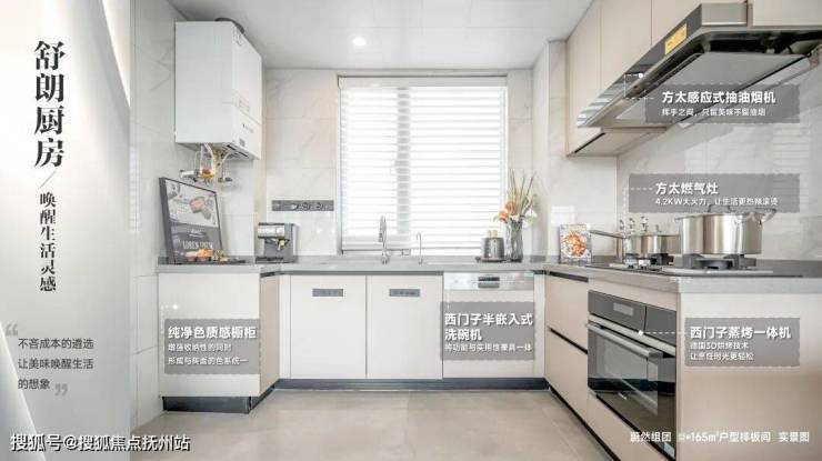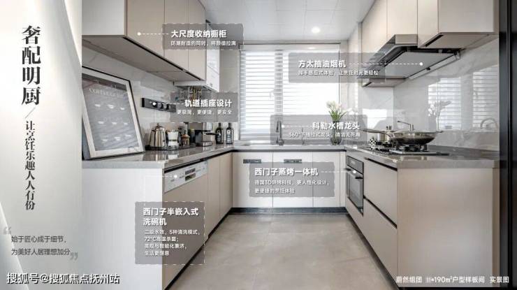 以方太、科勒、西门子等经典品牌,犒赏精英人群的高贵品位;以强收纳橱柜、轨道插座,尽呈空间美学。