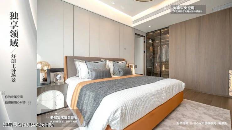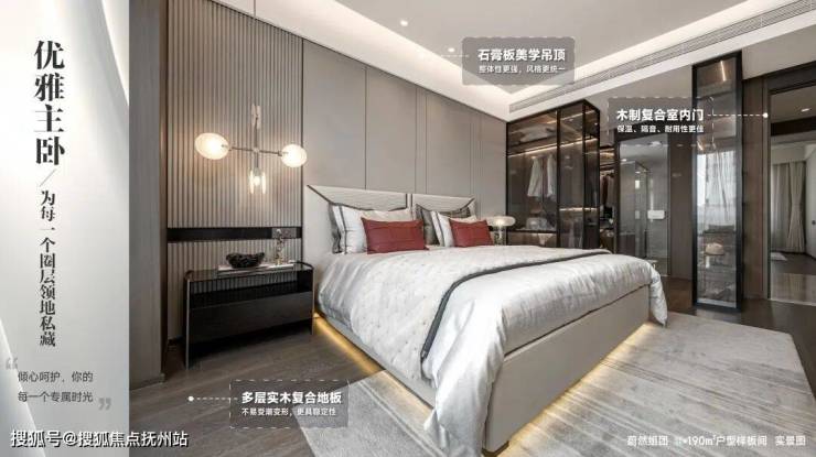 在自成一方秀场的主卧,以风格统一的吊顶与质感地板铺装,让每次仰望与俯首,都是自我愉悦的对望。