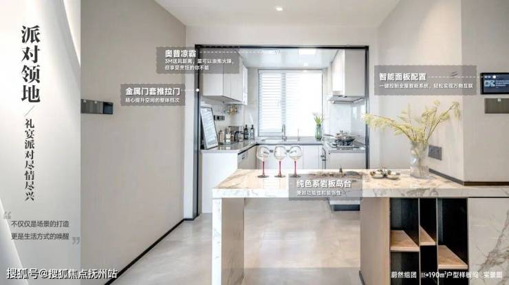 一方岛台,让聚会往来谈笑风生。奥普凉霸、金属门套推拉门等设计,提升格调与舒适。
