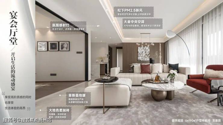 配备大金中央空调、松下新风系统、菲斯曼地暖,匹配感官统一的色彩,赋予礼宴派对更多质感品位。