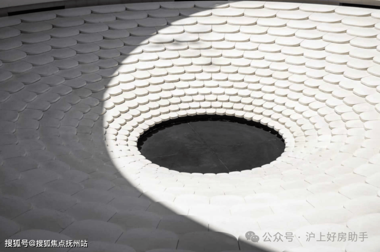 浮光池院水院会客厅,现已实景呈现,水景中央的艺术小品,如一滴水在湖面晕开,泛起阵阵涟漪。