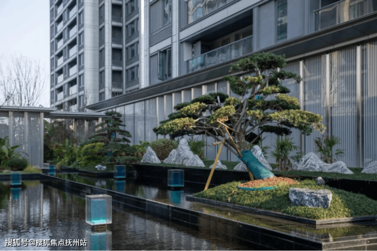 从社区前庭开始,桂语青澜以黑色奢石为基底,串联起置石、造型植物与多层镜面薄水,后方浅灰+银白色的格栅式立面,衬托出主景两株罗汉松的素雅大气。