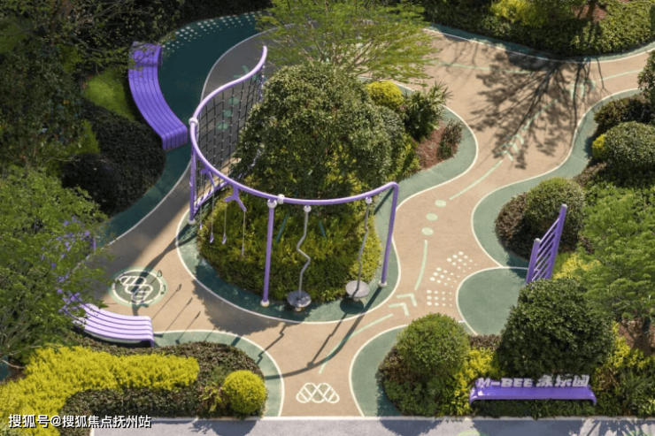 尤其是一些场地不算大,但功能复合度较高的融合场景,例如项目围绕园林景观,通过曲线划分出“儿童活动+ 家长陪伴”的童玩乐园,孩子既有肆意玩耍的空间,同时家长也能与孩子保持较近的安全距离。