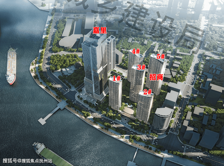 招商地块,一共5栋住宅,住宅高度42-45F,首层全架空,大概有588户,户均221m²。从效果图来看,流线型玻璃幕墙立面,大概率有270°转角观景窗,大门约52米宽,高层4F,4F配套会所看江泳池等,入户后就是户外的下沉庭院等,案名大概率是【招商长江序】,招商地块东南朝向,一线临长江,1、2号楼在第一排,看江无遮挡,对面为积玉桥。3号楼位于第二排,左右侧面还是会收到一定的视野遮挡,三排4、5号楼估计就是夹缝看江了。