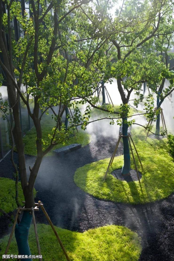 在有限的空间内,以与建筑同色的灰色围挡立面作为载体,任凭摇曳树影恣意投射之上,向阳乌桕,肆意怒放,光影静谧、庭院翠蔓,虚实互见,将空间清雅的气质进一步烘托。在看似冰冷、浮躁的都市里,树与场地,建筑,光影,相应成景,焕发出一沙一世界,一树一菩提的生命禅意。