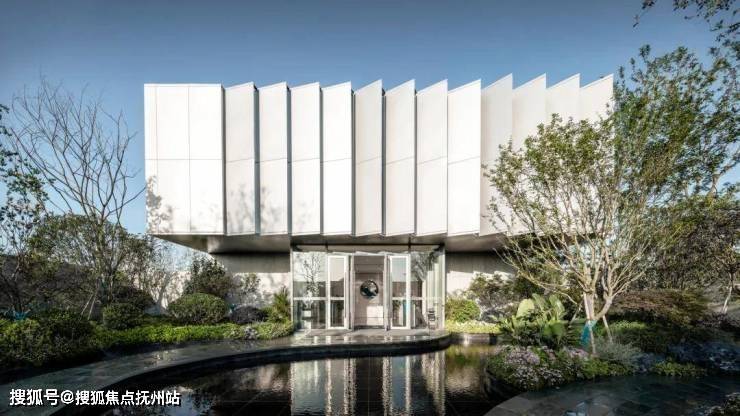 入口横向延展面设计从动态的夏溪河水纹中提炼意形与光影元素,融入到建筑的一体化设计中,大有“言入夏溪曲,光影转庭柯”的朗阔雅境,大气开阔又不失婉转潋滟。在地文化与现代审美相互渗透的秘境溪居跃然呈现于门庭,铺陈开崇高而永恒的流水情怀,隔绝喧嚣,启幕自然。