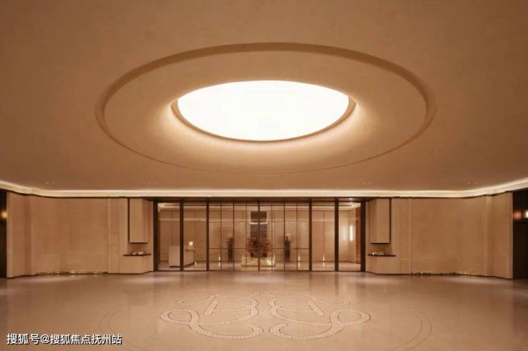 车道入口采用了动态追光照明,红洞石背景墙与藤编工艺LOGO散发出高级的调性,环氧磨石地面与紫藤花元素的铝板天花,让归家之路充满仪式感。