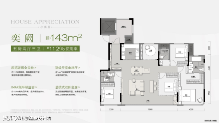 108-112%的得房率,尤其是143㎡更是实现了五房三卫的奢阔布局。这里不仅有: