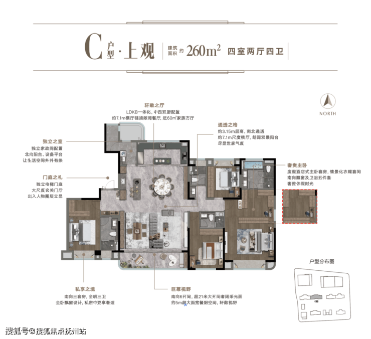 华琚雅苑深研当代塔尖圈层所需,在建面约260㎡臻质大平层中,打造昆山难得一见的约21米南向采光面、约7.1米超大阳台,极大地打开了空间与自然的界限,延伸宽厅形成更为敞阔的公共空间,是家的后花园,也是畅通无阻的健身跑道以及瑜伽区、室内高尔夫场,将塔尖逸趣、圈层社交、家庭乐趣尽情释放。