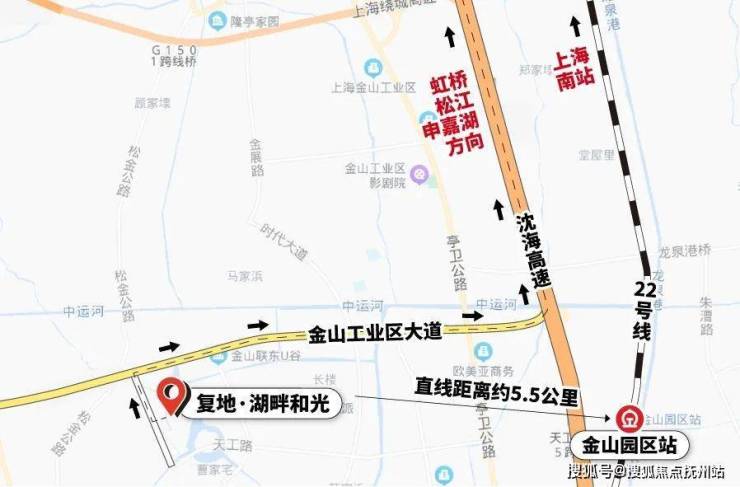 轨交方面,项目 离轨交22号线金山园区站直线距离约5.5km,可以去往上海南站,再坐三站地铁即到徐家汇。