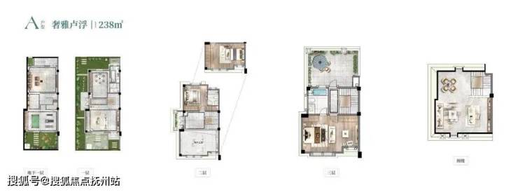 如建面约513㎡别墅户型,负一层可容纳泳池、影音室、台球室等多个休闲区;一层入户庭院贯通住宅北侧、南侧及西侧,室外延伸空间较大;二层、三层为主要居住区,二层可根据需求将客厅挑空改造成新的功能区;此外,还有一层阁楼。