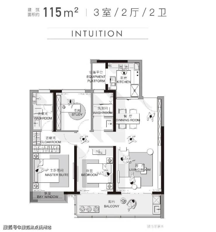 建面约115㎡三房两厅两卫:入户花园+餐客厅一体化+三开间朝南+南向双阳台+观景飘窗+双卫,非常适合初改家庭。