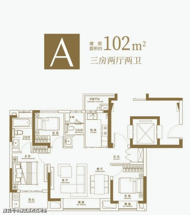 102㎡三居:三开间朝南,双卫设计,功能分区合理