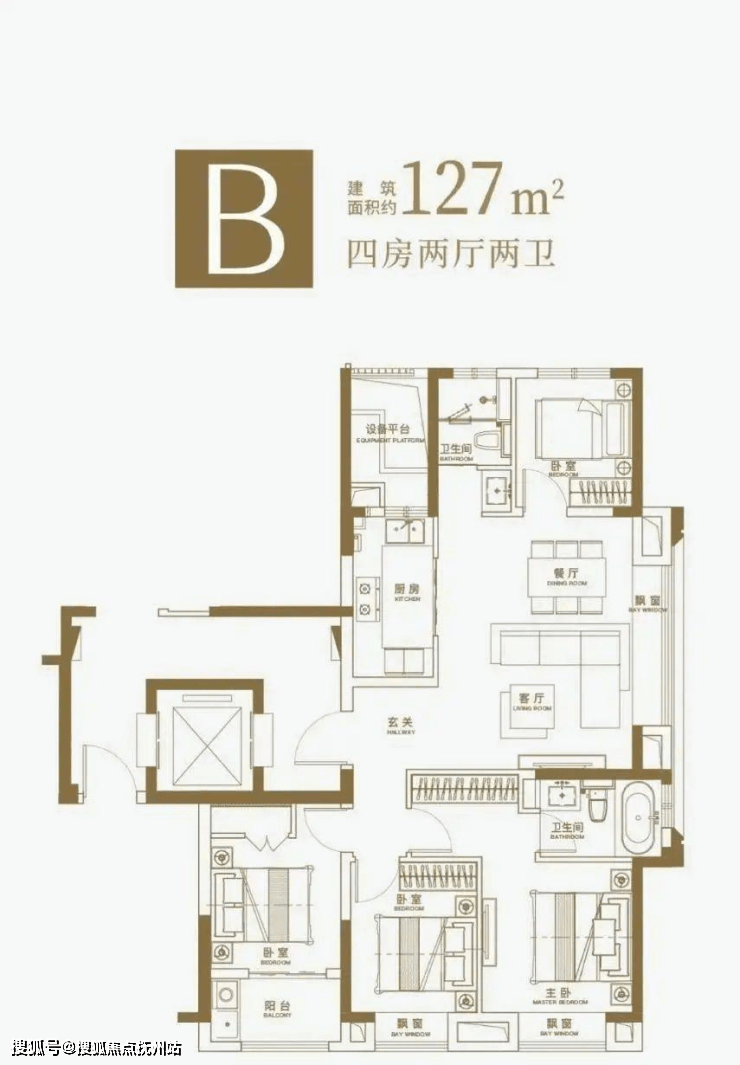 127㎡四居:宽境横厅,主卧套房,部分房源赠送私家电梯厅