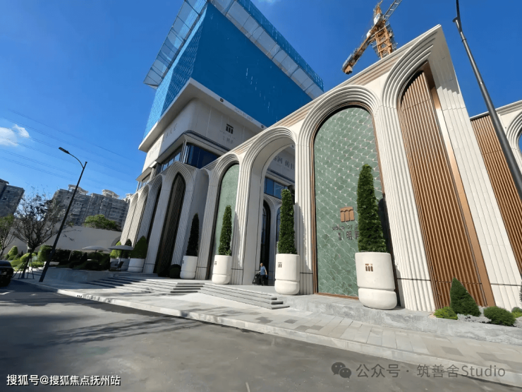 意式拱券元素:沿街面连续的石材拱券高达约12米,26个拱券阵列排布,营造出强烈的韵律与秩序感,呼应古罗马建筑风格。