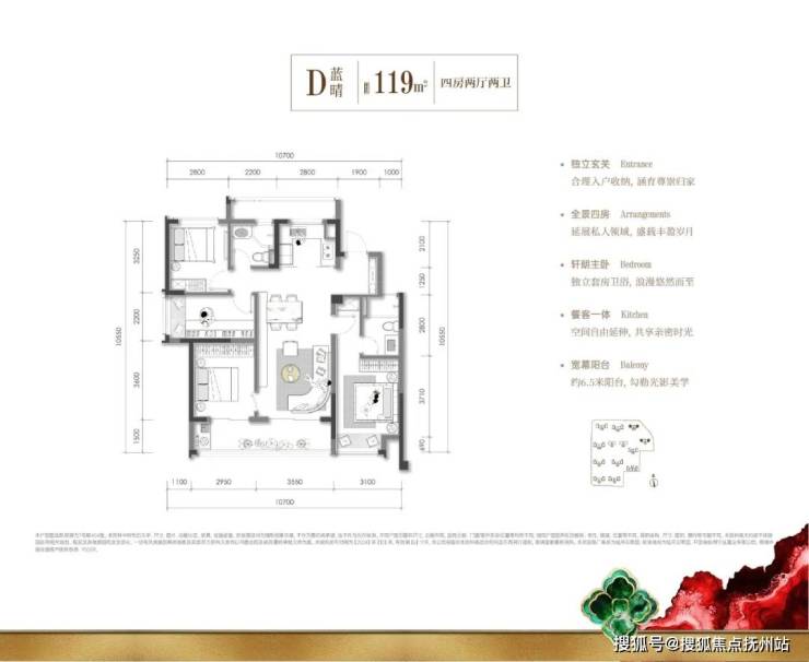 建面约119方精致四居,作为年轻人一眼心动的理想家,做到了难得一遇的边套南厅舒适四房格局,收纳功能与尺度共融合一,约6.5米双联大阳台与客厅联动,成就家人的高频互动场;独立玄关,延伸入户收纳空间;套房式主卧,设有独立卫浴与飘窗,直接带来居住感受的实质性跃升。