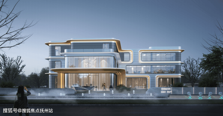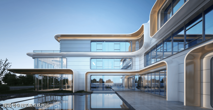 建筑立面采用直线倒角设计,以简洁现代的建筑风格表现建筑立面的线条关系。以冷色材料为主调,营造出高级大气的氛围。建筑造型呈扁长形流线型,通过体块的横向堆砌组合,模拟云朵漂浮的意境,营造宁静致远的空间感受。色彩方面,以冷白与香槟金色为主调。白色象征云的纯洁,香槟金色象征庐的奢华。