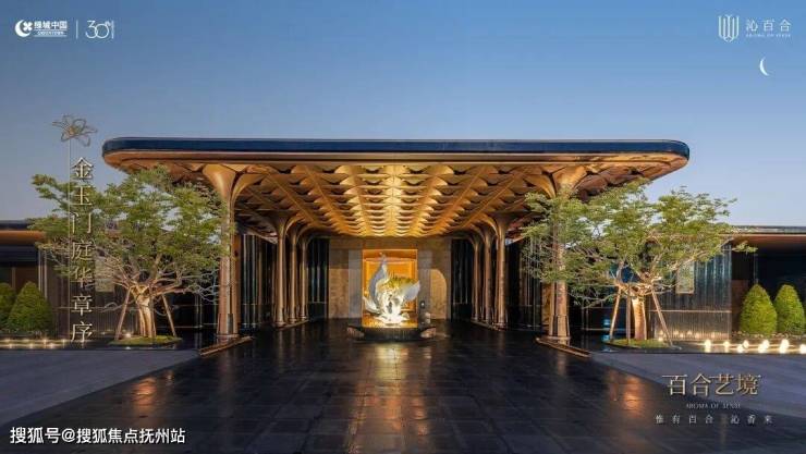 大门设计以8根巨型花瓣柱阵列、百合雕塑、莹光玉石大门、精工花瓣吊顶为理念,到(中央树池、安哥拉黑整石弧形水景)等实景组合形成静谧优雅的光影空间,将力的传递与美的造型完美结合。
