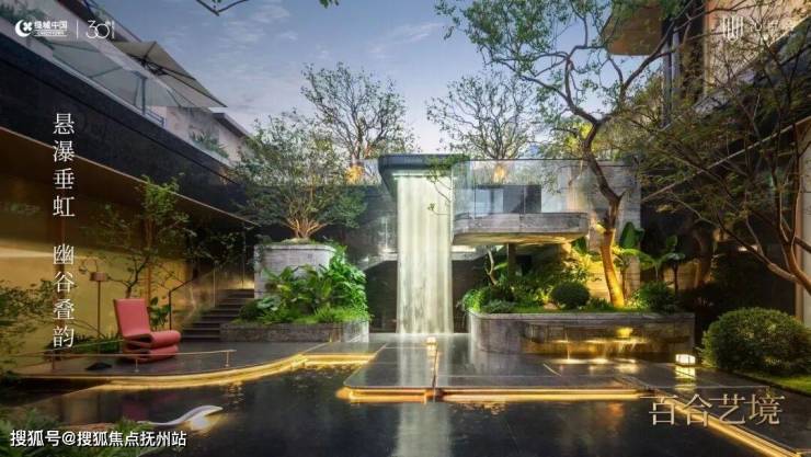 悬挑的飞瀑串联着地面和下沉空间,另外还搭配了阶梯式绿化、镜面树池错层平台,空间感很强。