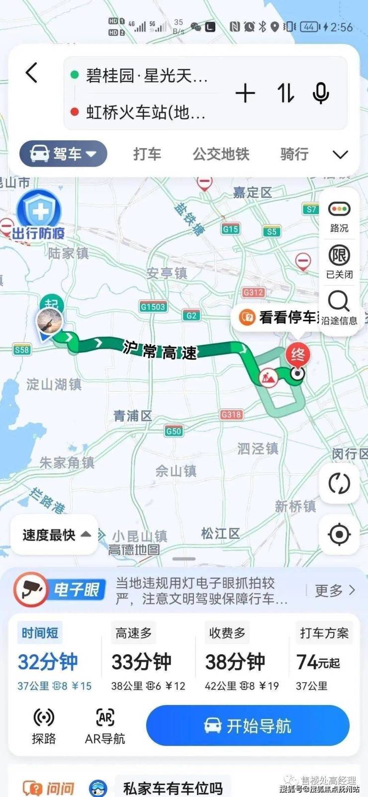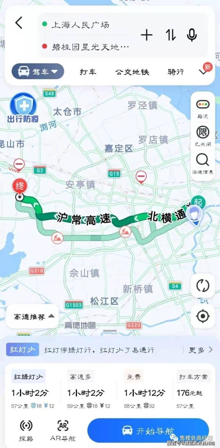 从人民广场驱车出发,自南北高架上进入北横通道后一路向西,借道北翟高架、沪常高速,最终在沪常高速千灯出口下桥,走机场路到达项目所在地。全程行驶约58公里,一路基本绿灯,得利于高速公路的通达便利,耗时不算久。(数据来源高德地图,仅供参考)