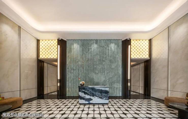 单元入户大堂的地面是「东方白」和「太古青金」拼花,背景墙是一整面的伊朗「金蓝玉」,美得就像艺术展厅。