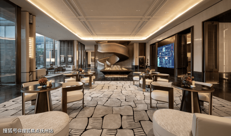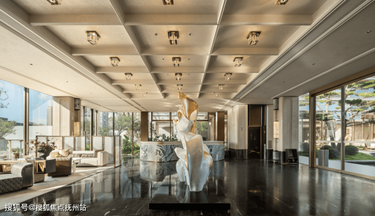 大门设计灵感源自世界顶奢安曼酒店,以宇宙黑奢石为基底,搭配两株精选造型的罗汉松,门口雕塑巧妙诠释“海上生明月”的美好愿景,尽显典雅与诗意。格栅嵌缀市花山茶花纹样,墨绿奢石铺陈沉稳底色,吊顶灯格如瓯绣编织天光每一处细节,皆在诉说归家即归礼的生活尊崇。