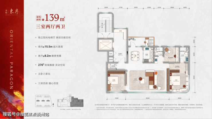 139㎡:15.5米巨幕面宽、8.2米大方厅、270°转角飘窗,可改四居,主卧大套房