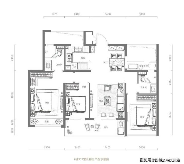 首先建面约101㎡三房两厅两卫的户型,做到了四开间朝南, 南向面宽拉到惊人的约12米,三个卧室+客厅都可以享受到南向充足的采光,单这一点,就打败了一般的高层产品。