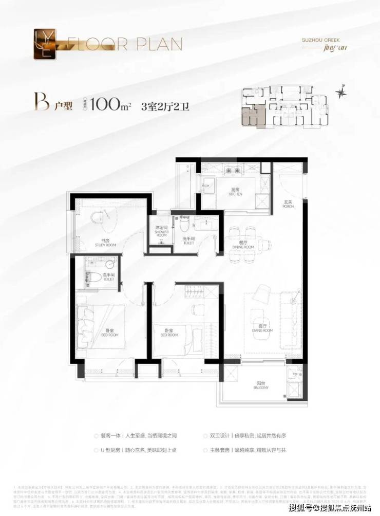建筑面积约100㎡3房D户型:南北通透的设计让该户型拥有更加优秀的通风效果。而且这个户型做到了全卧飘窗(3个飘窗)+南向瞰景大阳台,丰富的灵动空间提升了实得面积!