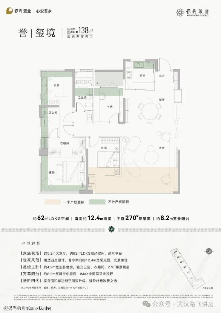 ②138㎡户型:四房两厅两卫,该户型为四房两卫,三开间朝南,入户玄关,南向面宽约12.4米,约8.2米的南向宽景阳台,完全动静分区设计,有62㎡的动区空间,双卧朝南,主卧为270°观景窗设计。