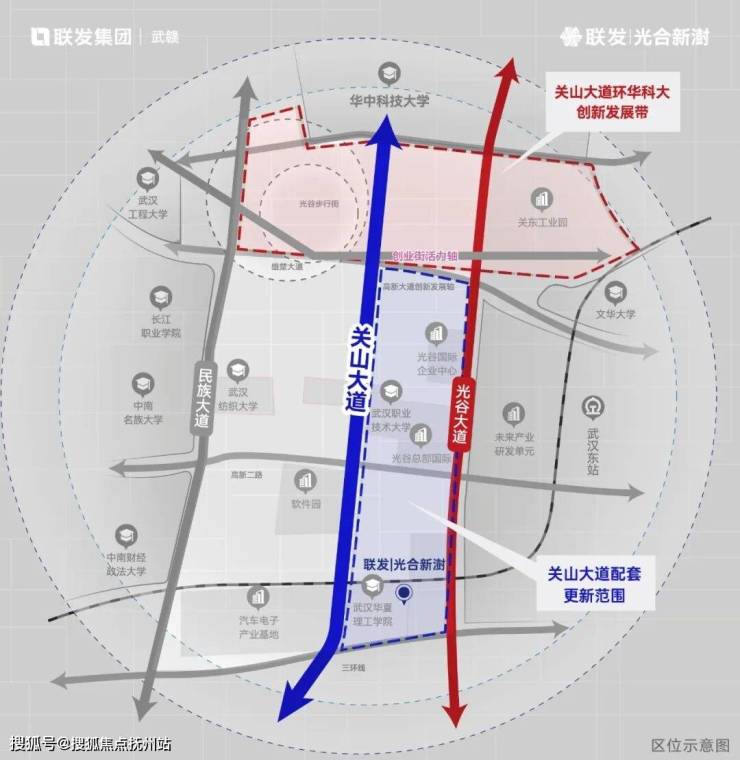 联发·光合新澍落子关山大道核心段,坐拥关山醇熟配套与“环华科大创新发展带”发展红利。关山大道直接与华科大相连,是光谷第一条主干道、首条产值过千亿的城市道路,也是光谷产城融合程度最高的区域,持续吸引着高知年轻家庭涌入。
