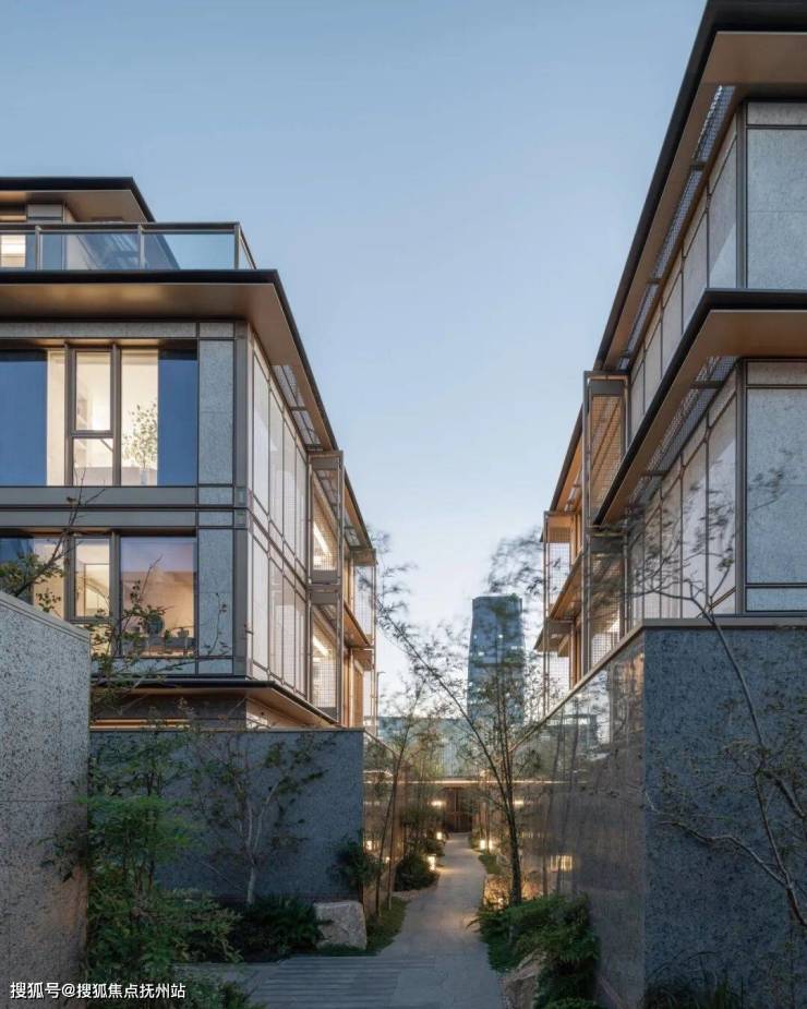 立面设计以“现代形制,东方意境”为笔法。合院立面汲取传统“平座上建屋”的形制逻辑,以深色石材基座构筑沉稳体量;浅色石材作载体转译格子门与横披窗的构成逻辑。细部处理上,将东方建筑符号转化为现代建筑语言:歇山顶山花处的悬鱼构件成为空中的雅致点缀;转角嵌饰回形纹椽头,将结构之美凝练为精致符号;雕花格栅源自宋代传统门窗的四抹头隔扇,以其通透特质引光入画,赋予建筑随时间流转的光影表情。叠墅立面则采用斜边框挑檐造型与舒展的水平线条,塑造出轻盈优雅的建筑形态,与东沙湖宁静开阔的景致相呼应。
