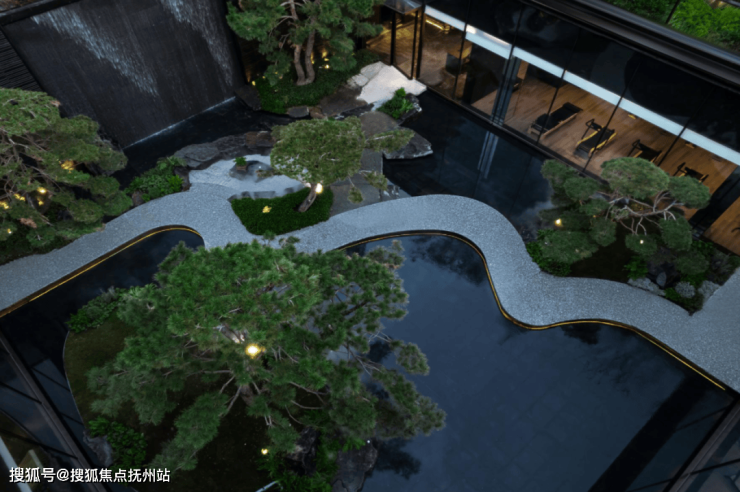 项目所在的地块堪称狮山极核——日趋紧张的当下,项目充分利用土地空间打造景观与公区。示范区园林,以“万壑松风”为灵感,提炼松林、飞瀑、石径、云雾、流泉五大场景,5棵泰山全冠移植的黑油松傲然挺立,约6米高的黑金沙花岗岩叠景墙流水潺潺,更有“翠玲珑竹节景墙”致敬沧浪亭,将苏州文化符号转化为可触摸的日常景观。整个社区景观面积充足,形成“内外双园”的格局,内部园林与外部运河景观相互呼应,为业主提供了静谧的休憩空间。